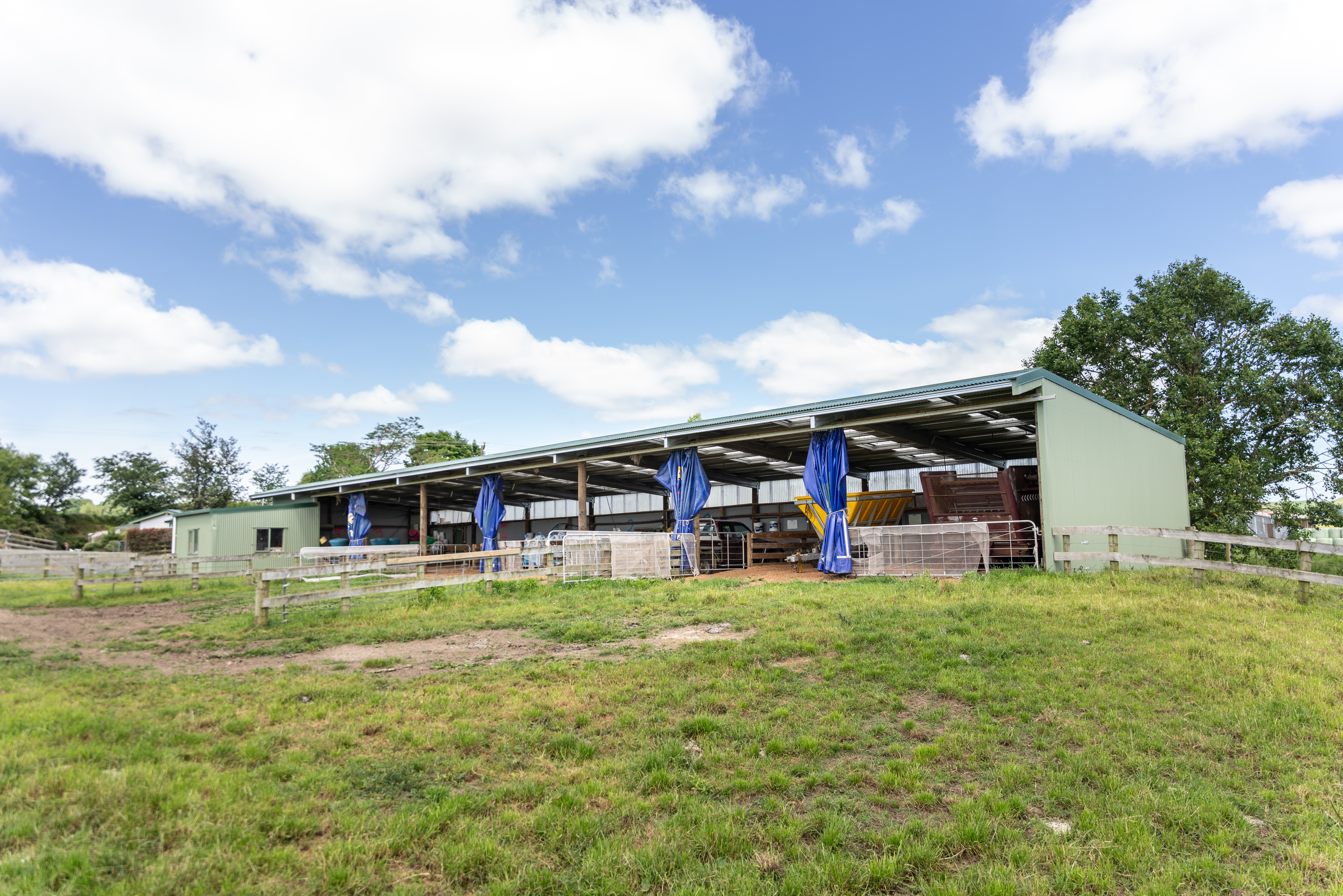 A purpose-built rural shed designed to house tractors and equipment year-round, with a flexible layout that converts into a calf shed for up to 150 calves during the season.